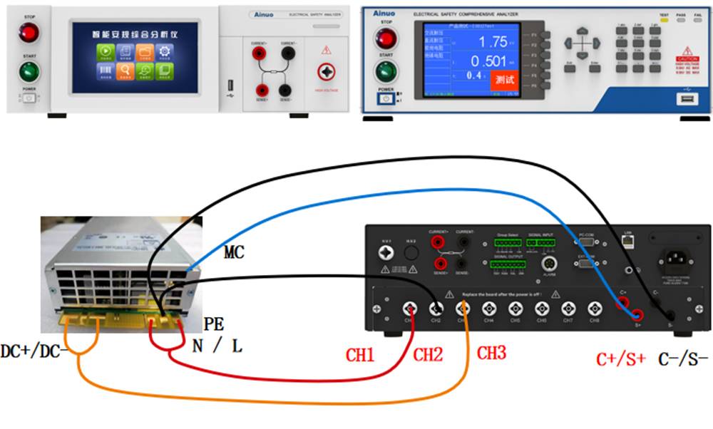 1)CH1(高压)--- CH2(低),输入L/N---MC之间的耐压测试,1s;
